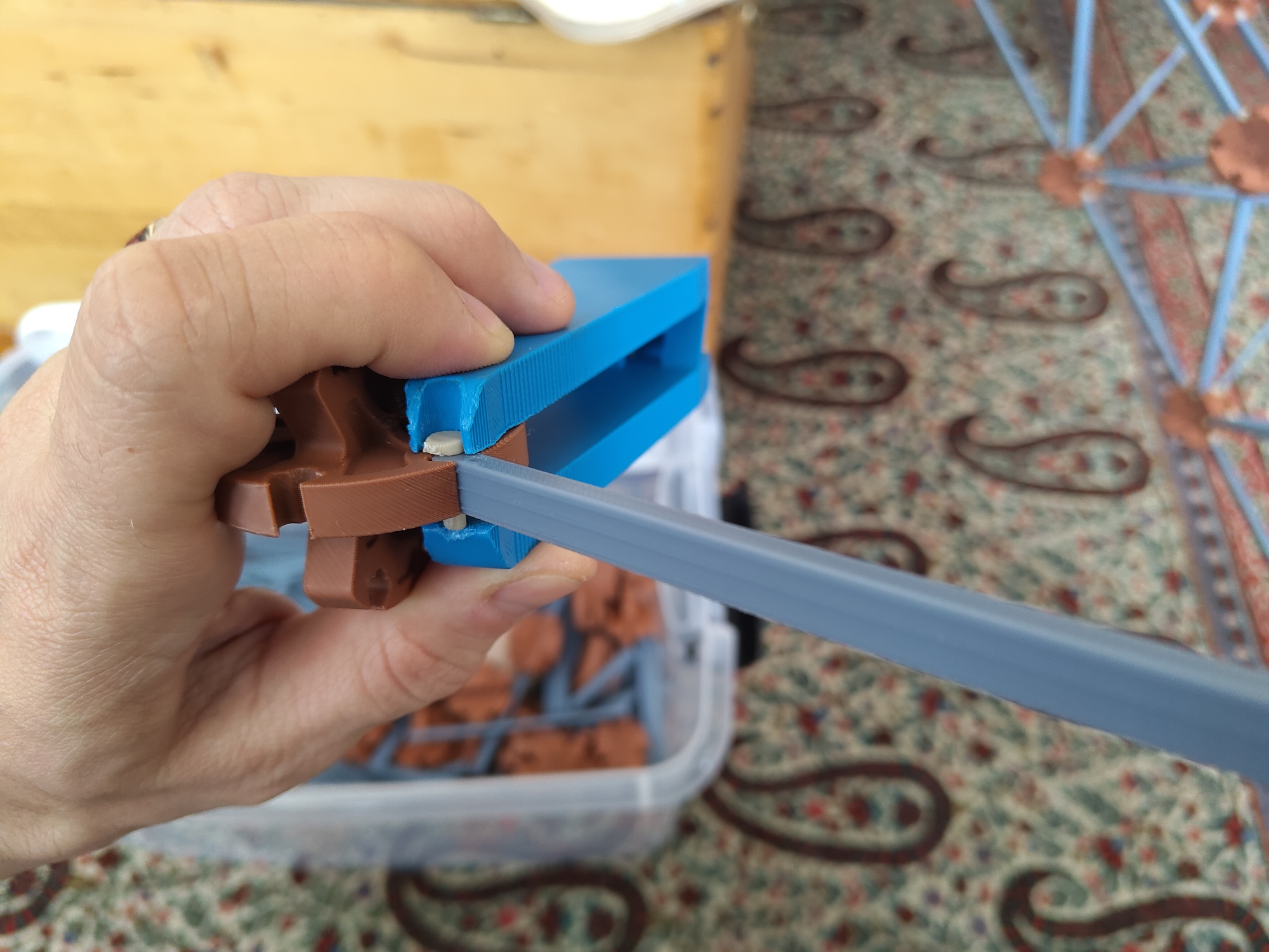 A few fabrication notes! Print orientation matters on all three part types, not just pins. Struts are easy, as they print without support material in their preferred orientation (flat on the bed), but nodes need to be massaged a bit. Printing them with any of the faces parallel to the print bed means at least a few of the joints will have weak spots and may break during pin insertion. Rotating them 45 degrees uses up a bit more support material but seems to produce much stronger parts. At 15% infill, 5 perimeters, and otherwise default settings, my P1S prints these in around 45 minutes each, so it's usually an overnight job when I need a bunch: